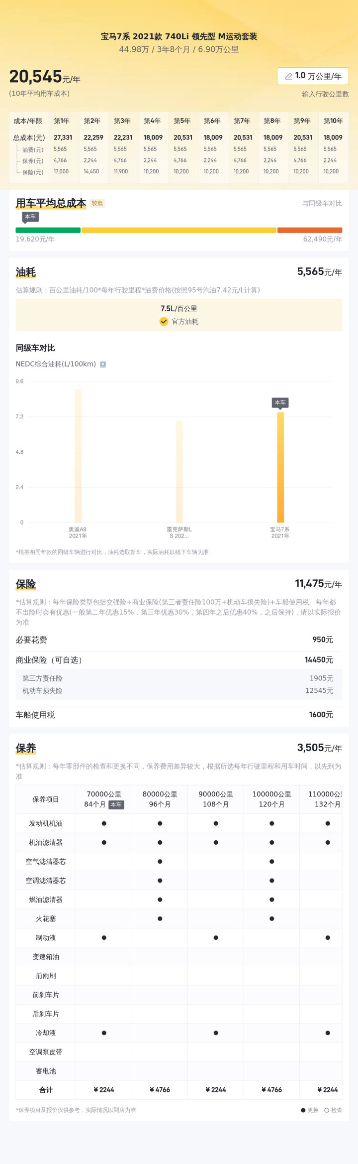 宝马7系 2021款 740Li 领先型 M运动套装,这位“先生”可是个能耗小能手!根据数据显示,它每年的能耗不过6161元,这在豪华车圈里,简直就像是喝杯咖啡就能撑一天的那种!保险和保养方面,每年大约13297元和3108元,这也算是行业内的“良心价”了~