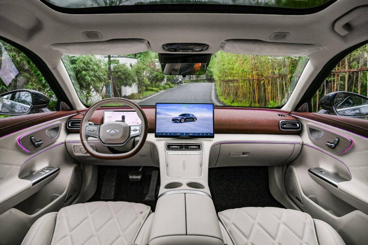 此次我们试驾的版本是风云A9L 2025款四驱高能巅峰版(以下简称风云A9L),拿到实车后,我迫不及待地将其开起来,整车配有鲲鹏超混CDM 6.0系统,今天试驾的版本由1.5T发动机和双电机组成,其中风云GT模式按键是我想体验的核心,在按下那刻,470kW的综合功率能被瞬间激活,854N•m的强劲扭矩带来了如跑车般的推背感,让这台定位偏商务范儿的车型也拥有了“西装暴徒”的实力。1.5T发动机介入时仅轻微嗡鸣,经过一路的实测,整车WLTC综合油耗为0.8L/100km。